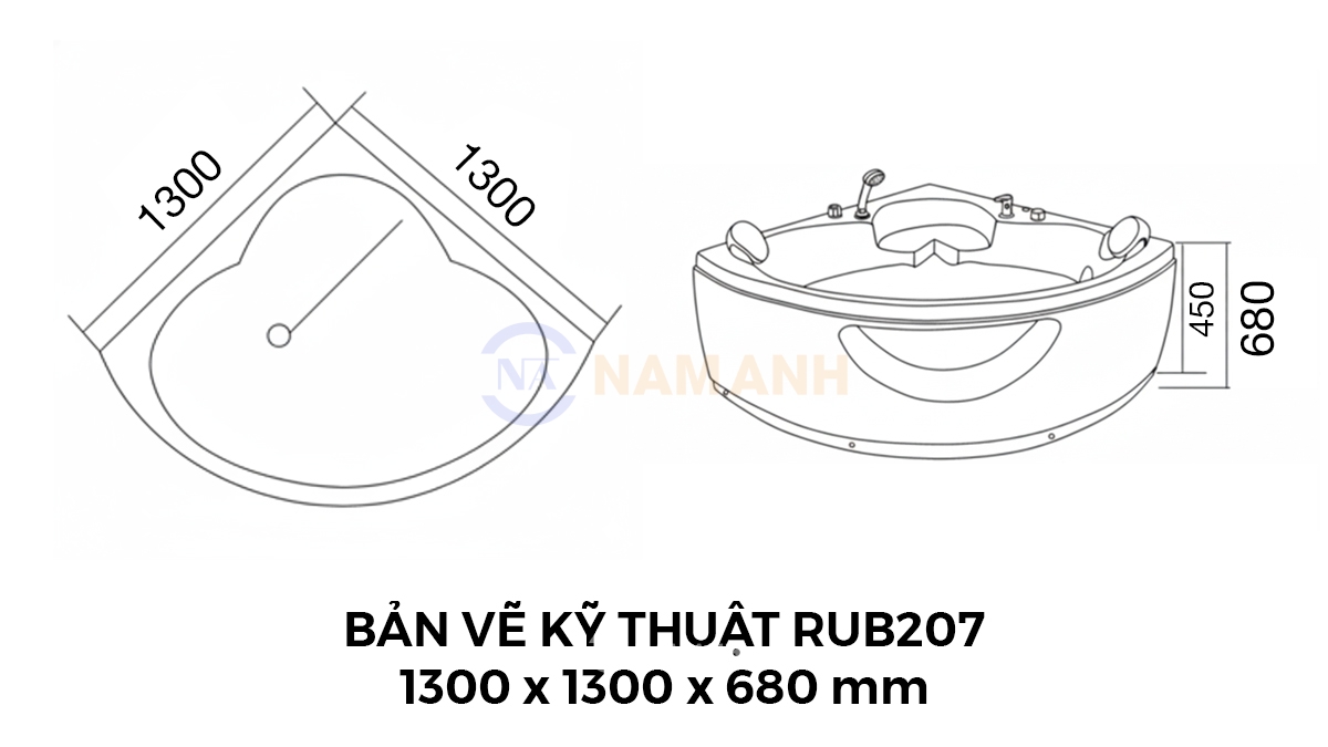 Bồn Tắm Góc Đôi Massage Rudi RUB207 1300x1300 mm Tam Giác