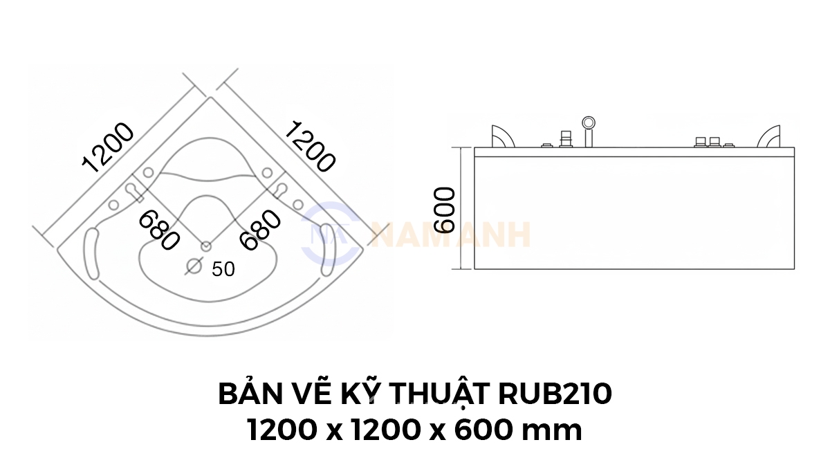 Bồn Tắm Góc Đôi Massage Rudi RUB210 1200x1200 mm Tam Giác